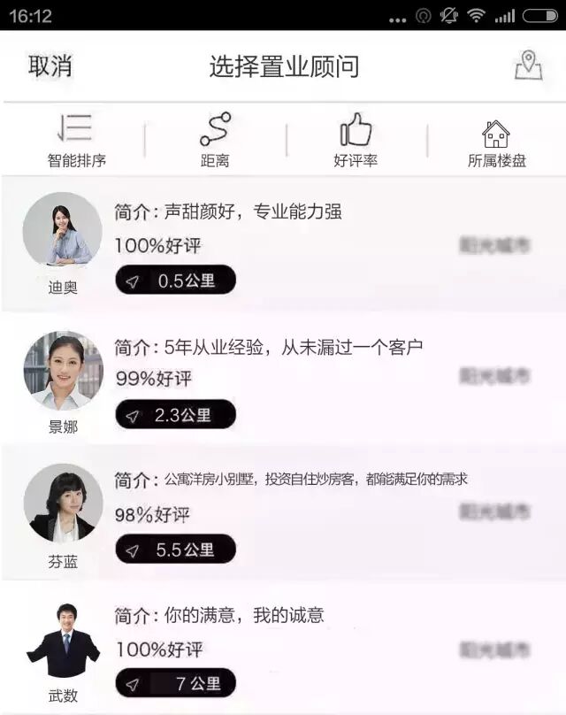 · 进入主界面,我们可以看到基于当前位置的置业顾问分布。